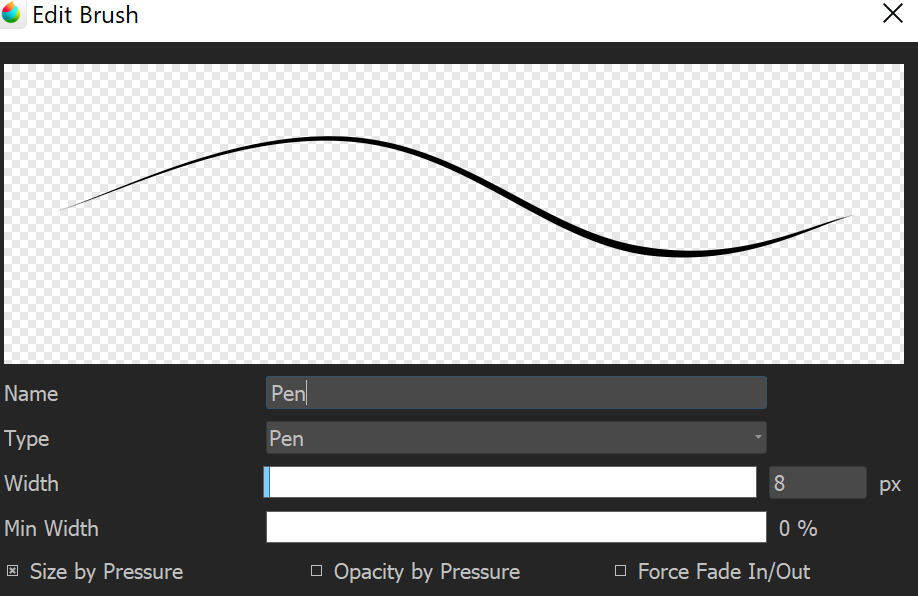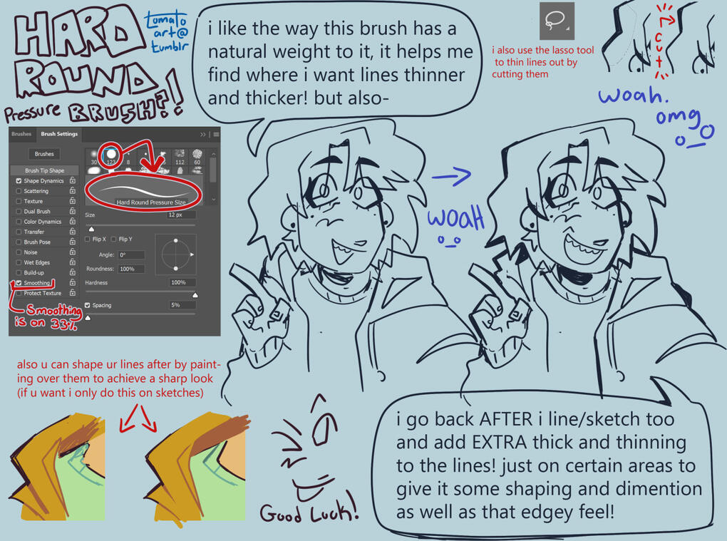 A: "Hard Round Pressure” brush! (or called "dip pen" on other programs). that’s about the only one I use other than airbrush occasionally for gradients + effects (on my rare crayon art i use a brush called “Pencil KTW 1 1″ if u google that the pack will come up) I use the fade filters and clipping masks usually to give texture without having to switch pens!